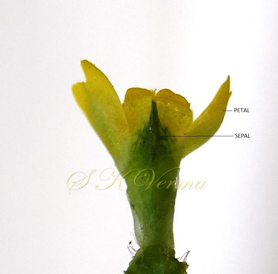 Annual or perennial, prostrate or erect, ca. 25 cm tall, succulent, glabrous, green or purplish green herb. Stem and branches with 3-20 mm long internodes. Leaves alternate, subopposite, spathulate or obovate-oblong to linear-oblong, attenuate at base, subsessile, obtuse or truncate, 3-25 mm x 1.5-8 mm, thick, fleshy, glabrous, glistening white below, green or purplish green above. Stipular appendages usually absent (or rarely very minute). Inflorescences usually in the forks of branches, cymose, with clusters of 2-8 flowers subtended by 4-leaved involucre, rarely flowers solitary and terminal. Flowers sessile, actinomorphic, bisexual, yellow, 3-8 mm across, bracteate; bracts membranous, ovate, ca. 3 mm long, acuminate, white or somewhat purplish. Sepals 2, subequal, basally united into a short, 2-3 mm long tube, keeled; lobes 2-3 mm long, acute, deciduous. Petals 5(-6), deliquescent, slightly united at base, obovate, 4-5 mm x 2-3 mm, yellow, emarginate with mucronulate notch. Stamens 6-12(-20), basally somewhat united and adnate to petals; filaments ca. 2.5 mm long; anthers ovoid, small. Ovary ca. 2 mm long, half embedded in calyx tube; style 1.5-2 mm long, stigmas 3-6, sticky, ca. 1 mm long. Capsule many seeded, 6-8 mm long, 3-4 mm in diameter, unilocular with circumscissile dehiscence. Seeds shining black, ca. 0.5-0.8 mm, reniform, tuberculate.