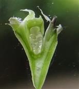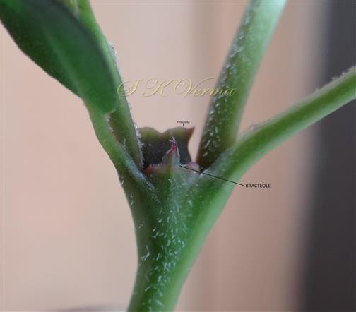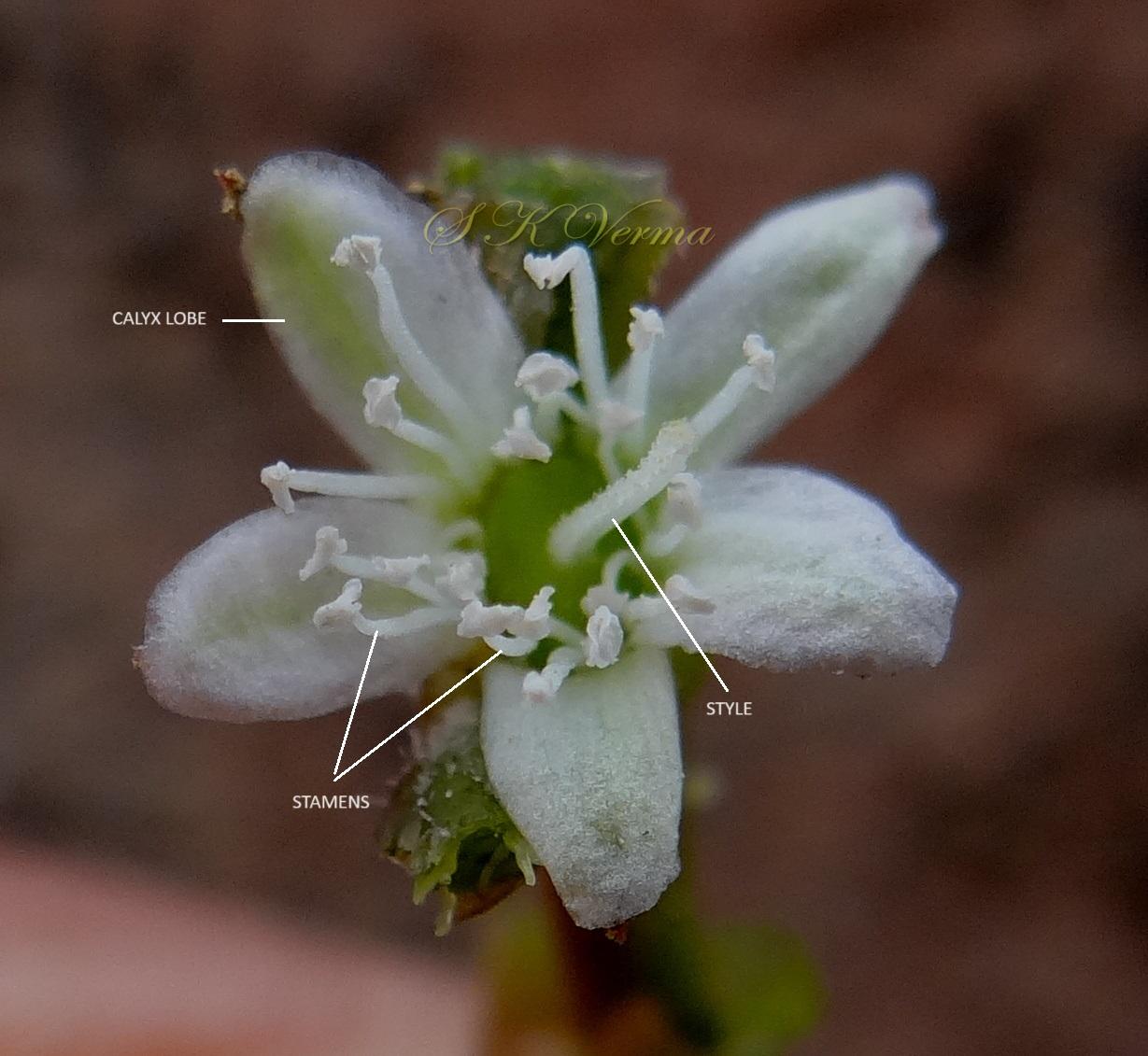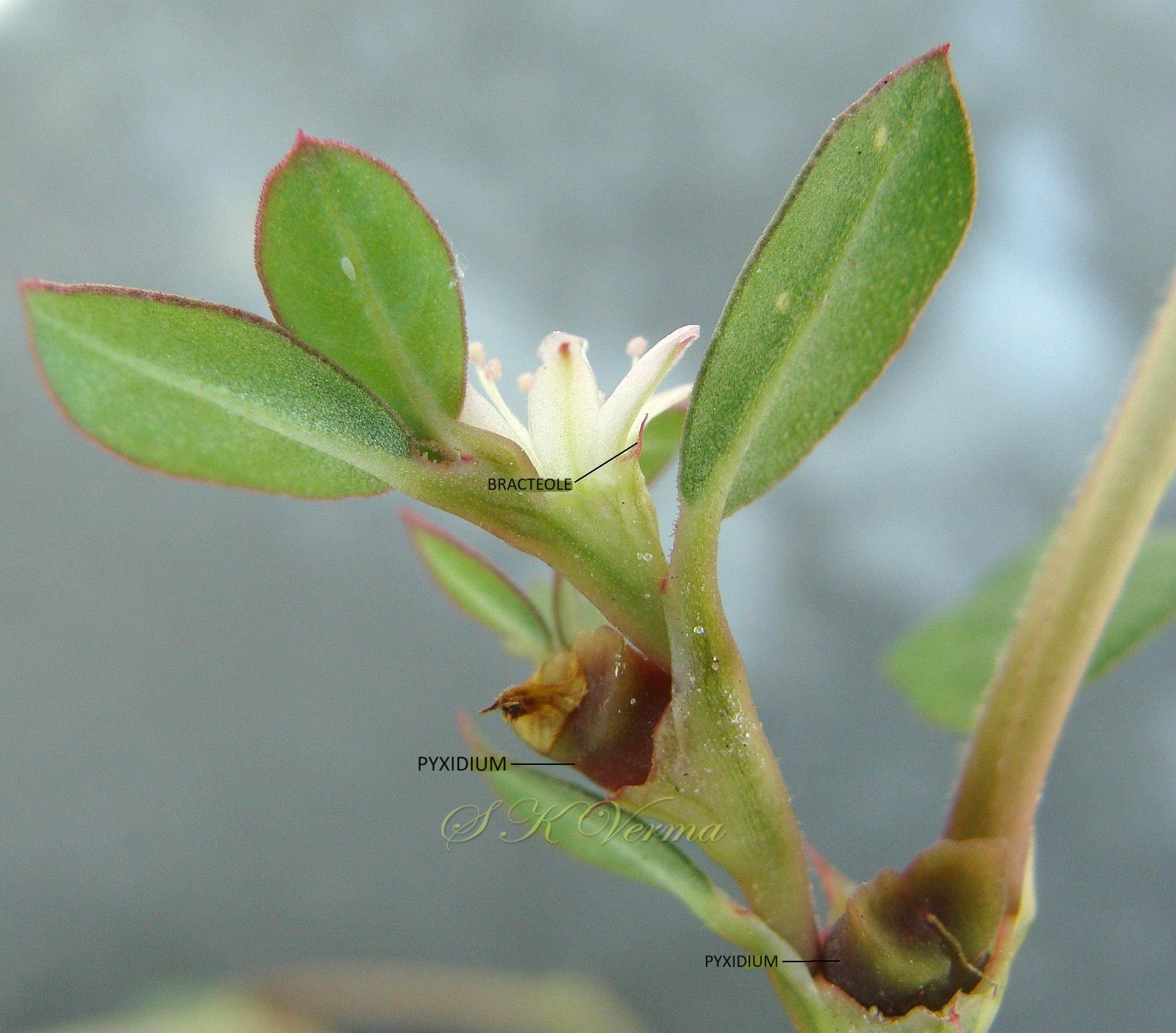 Annual herb. Stems procumbent, diffusely branched, branches up to 60 cm or more; branches subterete or slightly angular, glabrous or pubescent when young. Leaves opposite or sub-opposite, those of each pair unequal; petiole 4-20 mm long, base expanded into sheath ca. 2-2.5 mm long, sheaths of opposing leaf bases form a cup; petiolar sheath with 2 small lateral stipular appendages; leaf blade elliptic to ovate, obovate or obcordate, 0.5-5 cm x 0.4-4.5 cm, thinly fleshy, base cuneate, apex obtuse truncate or acute, margin entire and purplish pink. Flowers usually solitary, sessile, in the axils of smaller leaves (bracts) of some pairs, partly covered by sheathing stipules and connate bracteoles, bracteoles 2.5 mm x 1 mm, apex apiculate, purple pink. Calyx tube (Hypanthium or perigonium) closely sheathed by the petiolar base; calyx lobes 5, 5-6 mm x ca. 3 mm, lanceolate or oblong, petaloid, adaxial surface white or pink, obtuse with subapical abaxial mucronate spur, abaxial surface hairy. Petals and petaloid staminodes absent. Stamens perigynous, 15-26, adnate with hypanthium (perigonium) and calyx, unequal; filaments 2.0-3.5 mm long; anthers 0.75 mm x 0.5 mm, dorsifixed. Pistil 1, 2-carpellate, ovary superior with an impressed apex, 2- locular, placentation basal, ovules many; style 1, linear, ca. 2 mm long, longitudinally papillate; stigma 1. Pyxidium (capsule) cylindric, +/- curved, 4-7 mm x 4-5 mm, coriaceous, membranous at base; truncate at apex, apical wings 2, prominent, erect, crest- like; operculum 2.5-3.0 mm broad; dehiscence circumscissile at base; amphora 4-5 seeded. Seeds ca. 2 mm broad, reniform, black.