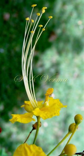 Shrubs or small trees, nearly 2 m tall. Branches green or farinose-green, unarmed or with scattered sparse prickles. Leaves 10-25 (-45) cm long, bipinnate; petioles long, pulvinate; pinnae 4-12 pairs, opposite, 6-12 cm long; petiolules short, pulvinate; leaflets 7-13 pairs, oblong or obovate, 1-2 cm x 3-8 mm, base oblique, apex emarginate, sometimes acute, margin entire; petiolules minute. Flowers zygomorphic, bisexual, pentamerous, perigynous, large, showy, ca. 3.7 cm across, yellow or orange-red, in terminal or axillary corymbose racemes, lax, up to 25 cm long. Pedicels unequal in length, 4.5-7 cm long. Receptacle concave to turbinate, glabrous. Bracts small, linear, caducous. Sepals 5, glabrous, ca. 1 cm long, lowest (anterior or adaxial) one large, ca. 1.4 cm long, green or red. Petals 5, free, yellow, orange or red with yellow or creamish-white margin, orbicular, 1-2.5 cm long, the upper petal (posterior or abaxial) smaller and of different colour (yellow), margin wavy, with claw subequal to limb in length. Stamens 10, free, all fertile, very far exserted; filaments white or red, 5-6 cm long, thick and hairy in basal part; anthers small. Ovary glabrous, unilocular, ovules many, placentation marginal; style orange-yellow, long, 5-6.5 mm. Legumes blackish-brown when ripe, oblanceolate-oblong, 6-10 cm x 1.5-2 cm, straight, smooth, glabrous, flattened, apex rounded, sharp beaked, dehiscent. Seeds 6-9.
