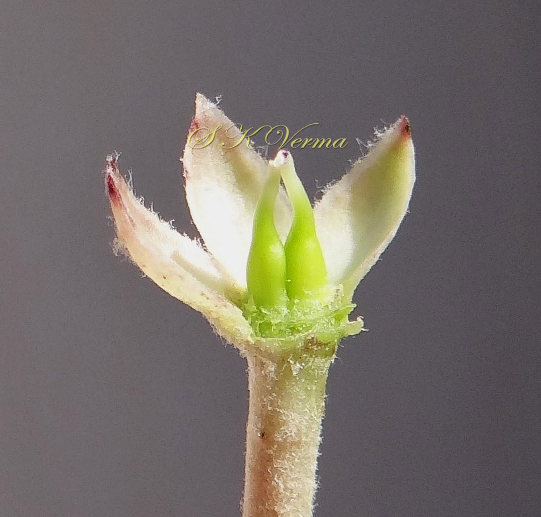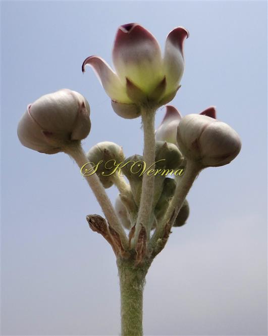 An erect shrub, 90-120 cm high, young plants clothed with white cottony tomentum. branching from near the base, branches terete, white-tomentose. Leaves opposite, 5-16 cm x 3.7-10 cm, subsessile, broadly ovate, ovate-oblong, elliptic or obovate, margin entire, base more or less deeply cordate, apex abruptly acute or short acuminate, dull-green, thick, fleshy, glabrous or so adaxially, white-tomentose abaxially. Inflorescence umbellate cymes with 3-10 flowers; peduncle axillary, stout, 5-12 cm long. Flowers ca. 2.5 cm across, white outside, purple within, scented, tomentose when young becoming gradually glabrous; flower buds globose; pedicels 1.2-3 cm long. Calyx divided to base; lobes 5, ca. 5 mm x 3 mm, acute, ovate. Corolla campanulate,1.5-2 cm in diameter and 1-1.2 cm long, glabrous, divided 2/3rd the way down; tube very short; lobes 5, 7-10 mm x 6-10 mm, erect, ovate or ovate triangular, acute, white outside and inside purple towards tip and white at base, valvate in bud. Corona equalling or exceeding staminal column, of 5 fleshy, laterally compressed processes adnate to and radiating from the staminal column, base of each process produced into an upcurved, involute spur, the apex bifid, obliquely truncate. Stamens 5, inserted at base of corolla and alternate with its lobes; filaments united in a short fleshy column around the ovary, apex of staminal column united to much dilated stigma forming the stigmatic disc or gynostegium; anthers bithecous (2-celled), short and broad, with broad short membranous inflexed appendages, coherent around the stigmas; pollens of each cell united in waxy pollen masses, the pollinia, pollinia pendulous in cells; pollinia of the adjoining cells of two contiguous anthers united in pairs by horny appendages (caudicles) to black dot-like glands, the corpusculum lying at the angles of stigmatic disc; two pollinia with caudicles and corpusculum form the Translator Apparatus acting as a means of pollen dispersal by insects. Carpels 2, apocarpous; ovaries 2, free, enclosed within staminal column, superior, unilocular, ovules many on marginal placentas; styles 2, free, united into stigma; stigma large, pentagonal, flat, depressed. Follicles 7-10 cm x 5-8 cm, double, recurved, obliquely ovoid, inflated, smooth; pericarp spongy. Seeds 1 cm long, broadly ovate, flat, minutely tomentose, light brown; coma silky, +/- 3.7 cm long.