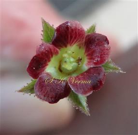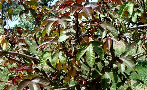 A soft-wooded erect shrub, to 3 m tall, monoecious. Stems erect, brown, sparsely to much branched, woody-succulent, hirsute, glandular when young. Short shoots absent; latex viscous, colorless. Leaves persistent or drought-deciduous, +/- evenly distributed on long shoots; petiole 3-14 cm long with branched stipitate glands adaxially; leaf blade cordate to ovate in outline, dark bronze-coloured, 4-18 cm x 4-13.5 cm, 3-5-lobed, palmatifid or palmatipartite, median lobe 4-10 cm x 2-5 cm, the laterals smaller, 3-5-veined from base with 9-12 pairs of lateral veins per lobe, margins usually serrulate-denticulate or glandular-ciliate, rarely entire, apex acuminate, membranous, surface glabrous or sparsely hairy, especially on veins. Stipules persistent, slender, multifid, 3-4 mm x 5-6 mm, each segment filiform, ending in stipitate gland. Inflorescence bisexual, terminal and subterminal cymes, paniculate, 8-18 cm long with 6-8 cm long peduncle; bracts 6-16 mm long, linear-lanceolate, margin entire, glandular-ciliate; pedicels 1-2 mm. Male flowers: Sepals 5, connate at base, lobes lanceolate to elliptic-lanceolate, 2 mm x 1 mm, acute, margin stipitate-glandular and ciliate. Petals 5, imbricate, campanulate, connate 1/4-1/2 length, broadly obovate, 3.5 mm x 2 mm, apex rounded, orange-red to purple with lighter centre. Disc glands free, turbinate, truncate. Stamens 8, the 5 outer 2 mm long, the 3 inner 3 mm long; anthers 0.6 mm long, filaments of each whorl connate 1/4-1/2+ length, outer whorl 1.4-3 mm, inner whorl 1.8-4 mm. Female flowers: 8-9 mm across. Calyx ca. 6 mm long, sepals 5, connate at base, lobes lanceolate to elliptic-lanceolate, 5 mm x 3 mm, acute or acuminate, margin stipitate-glandular and ciliate. Corolla campanulate, petals 5, connate for 1/4-1/2 at base, lobes broad, 3 mm x 3.5 mm, broadly obovate, apex rounded or shallowly retuse. Disc shallowly 5-lobed, the lobes retuse. Ovary trilobate-subglobose, ca. 2 mm x 2 mm, somewhat hirsute; trilocular, each loculus with one ovule; styles 3, 1-1.5 mm long, bifid. Fruit rounded-trilobate, ca. 1 cm x 1 cm, sparingly hirsute to subglabrous, septicidally and loculicidally dehiscent. Seeds compressed, ovoid-ellipsoid, 9 mm x 6 mm, pale greyish-brown, caruncle multifid, 3 mm wide.