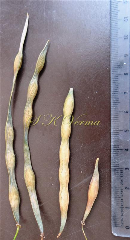 An evergreen shrub or small tree, up to 4 m tall, armed, bark thin, smooth, branches green, glabrous or glabrescent, armed. Leaves alternate, distant or crowded, bipinnate; rachis short and indurated ending into ca. 1 cm long spine, woody, often with a pair of stipular spines at its base, up to 5 mm long, sometimes stipular spines absent. Pinnae 2-4 (-6), 15-40 cm long, rachises winged, flattened, nearly 2-2.5 mm wide; leaflets 25-75 pairs, 2-4 mm x 1-2 mm, oblong-obovate or obovate, apex rounded, rarely truncate or emarginate; petiolules minute, 0.5 mm long. Flowers zygomorphic, bisexual, pentamerous, perigynous, 1.8-2.5 cm across, yellow, fragrant, in lax axillary 8-15 cm long racemes; pedicels 1-1.3 cm long, slender, spreading, jointed near the flower. Calyx 7-8 mm long, cleft nearly to base, calyx tube short, lobes 5, ca. 6 mm x 2 mm, unequal, oblong, obtuse, deciduous. Petals 5, yellow, 2.3-1.8 cm x ca. 10 mm, broadly obovate or suborbicular, veined, with short, stout, villous claws, uppermost petal broader, with long claw and red spots. Stamens 10, free; filaments unequal, flattened, villous at base; anthers uniform, ovoid, bithecous, versatile, dehiscence by lateral slits. Ovary shortly stipitate, silky-villous, unilocular, ovules many; style filiform, glabrous; stigma minute, terminal. Legumes 7-12 cm x 6-10 mm, moniliform, flattened between seeds, slender, attenuated at both ends, thin, longitudinally veined, glabrous, 1-6 seeded. Seeds ca. 9 mm x 4 mm, oblong, nearly terete, smooth, mottled light and dark brown.